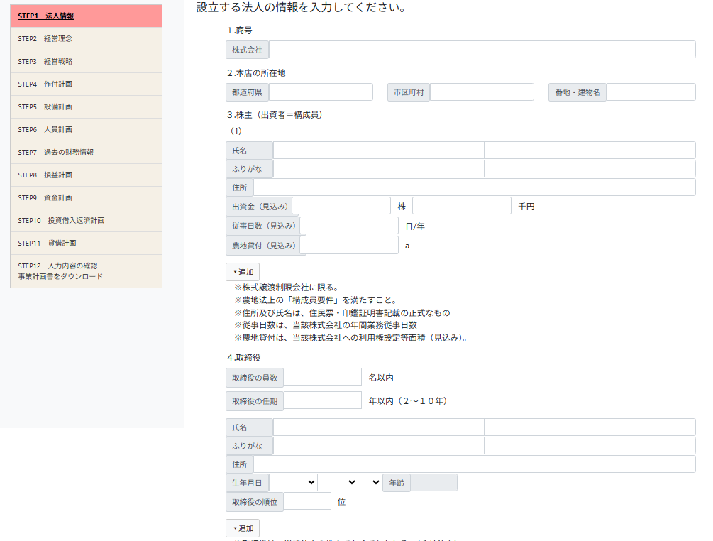 決算書のデータなどの情報を入力するだけで、設立する法人形態(農事組合法人、株式会社)に合わせて、事業計画書(作付計画、資金計画、人材計画など)を簡単に作成できます。