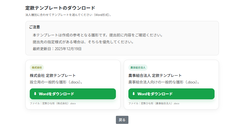 法人形態(農事組合法人、株式会社)に合わせた定款のサンプルを無料でダウンロードし、自由にカスタマイズすることができます。